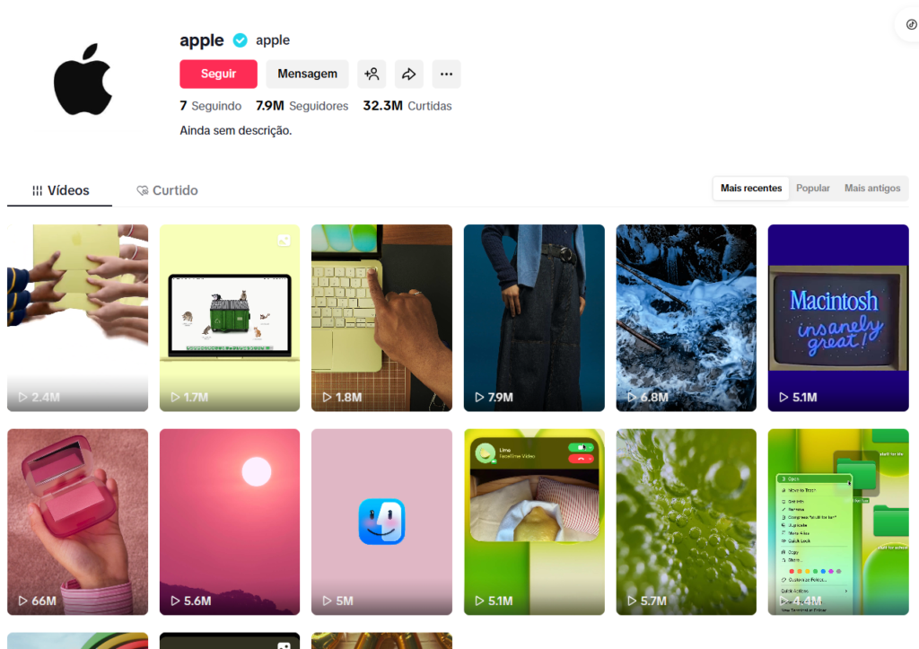 A solução? Não mexer em time que está ganhando — o que no TikTok não importa se ela mudar a estratégia, afinal a plataforma não é uma vitrine — e iniciar uma aproximação mais calorosa, trazendo as pessoas para perto como o @helloapple, assim evitando conflitos de interesse.